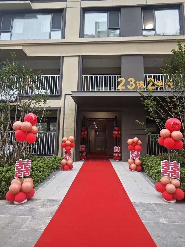 婚礼当天,物业团队早早投入现场布置。他们在单元门口铺设红毯,搭配精致路引,喜庆氛围瞬间洋溢;电梯内铺上“开门见喜”地毯,步入其中,满眼皆是幸福;小巧的喜字还被巧妙点缀于电梯按钮,细节之处传递着暖心;入户门厅的氛围布置同样别致用心,立牌与喜字灯笼相映成趣,更添雅致与温馨。